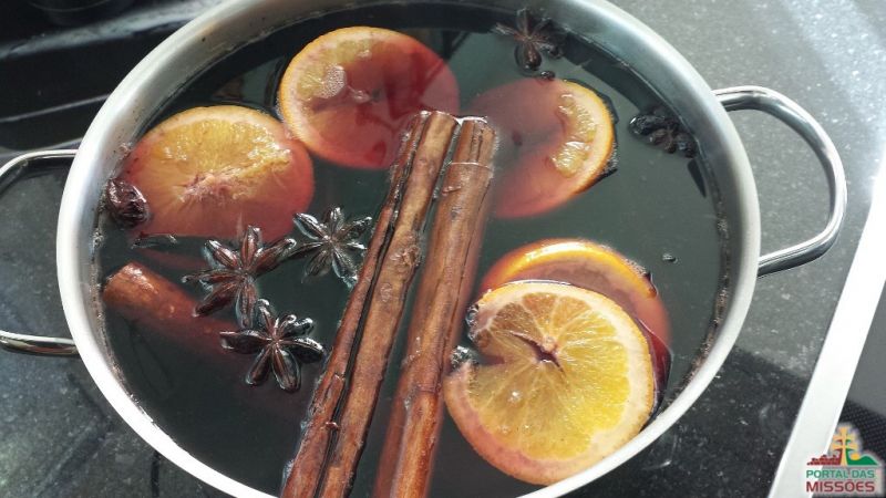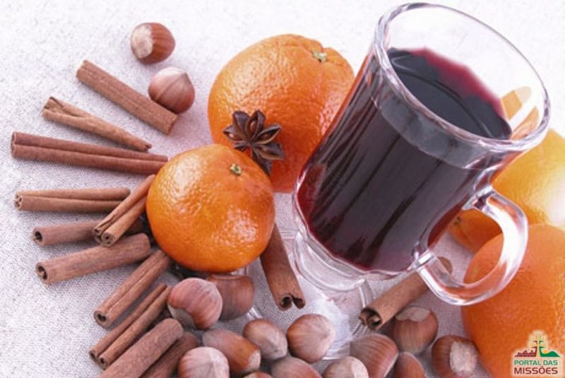 Ingredientes: 3 litros de vinho tinto suave - 300 ml de água - 10 ramas de canela em pau - 4 pedaços de gengibre - 10 cravos - Canela em pó para polvilhar